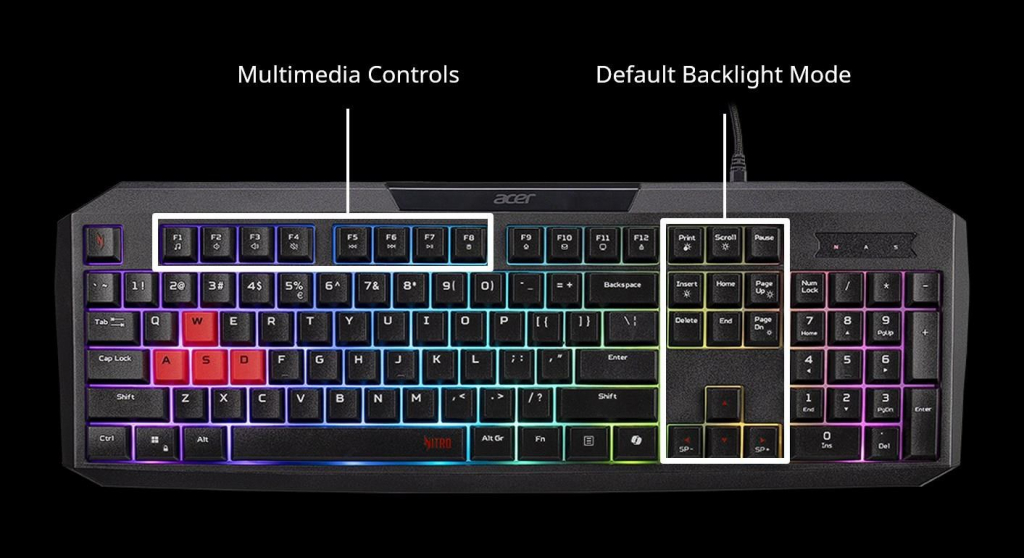 ACER Nitro Gaming Keyboard 100, Membrane Switch, 26 Anti-ghosting kláves, životnost 3 mil. stisků, 7 zón RGB podsvíc