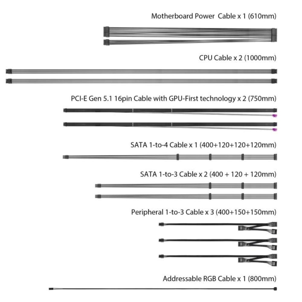 Výkon zdroje (W):1600; Formát zdroje:ATX; Konektory:8pin CPU 1x, 8pin CPU 2x, PCIe 6-pin, PCIe 8-pin, PCIe 16-pin Gen5, SATA 15-pin, Molex; Konektory pro základní desku:ATX 20-pin, ATX 24-pin, EPS 8-pin; Modulární kabeláž; Efektivita zdroje:80 Plus Titanium; Vlastnosti zdroje:Modulární kabeláž; Podsvícení:ARGB