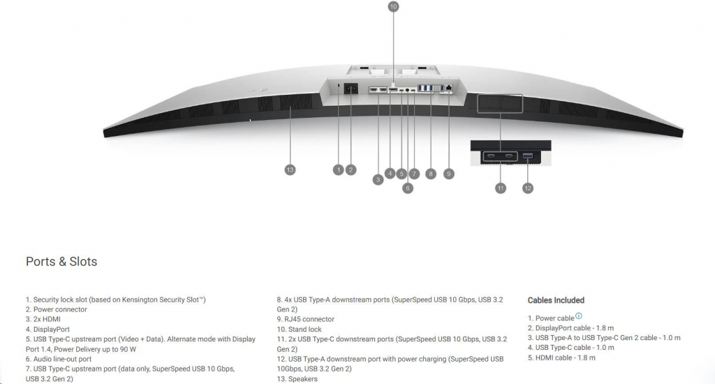 9. RJ45 connector 10. Stand lock 11. 2x USB Type-C downstream ports (SuperSpeed USB 10 Gbps, USB 3.2 Gen 2) 12. USB Type-A downstream port with power charging (SuperSpeed USB 10Gbps, USB 3.2 Gen 2) 13. Speakers |