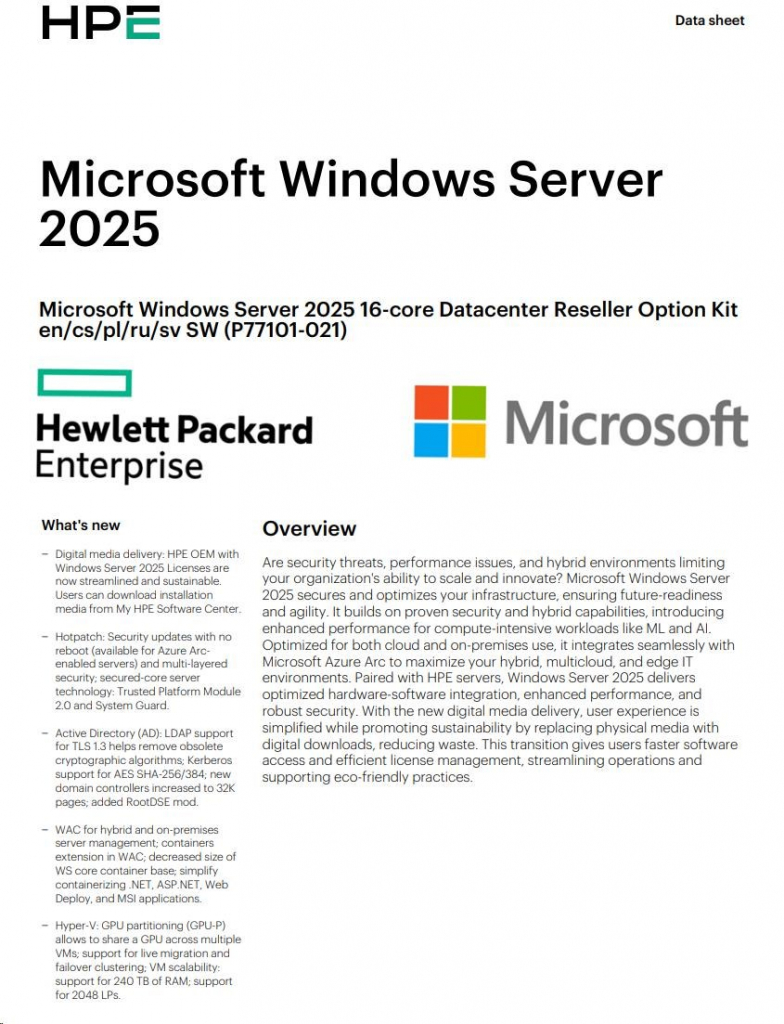 HPE Microsoft Windows Server 2025 16-core Datacenter Reseller Option Kit (CZ EN Russia Pol Sw)