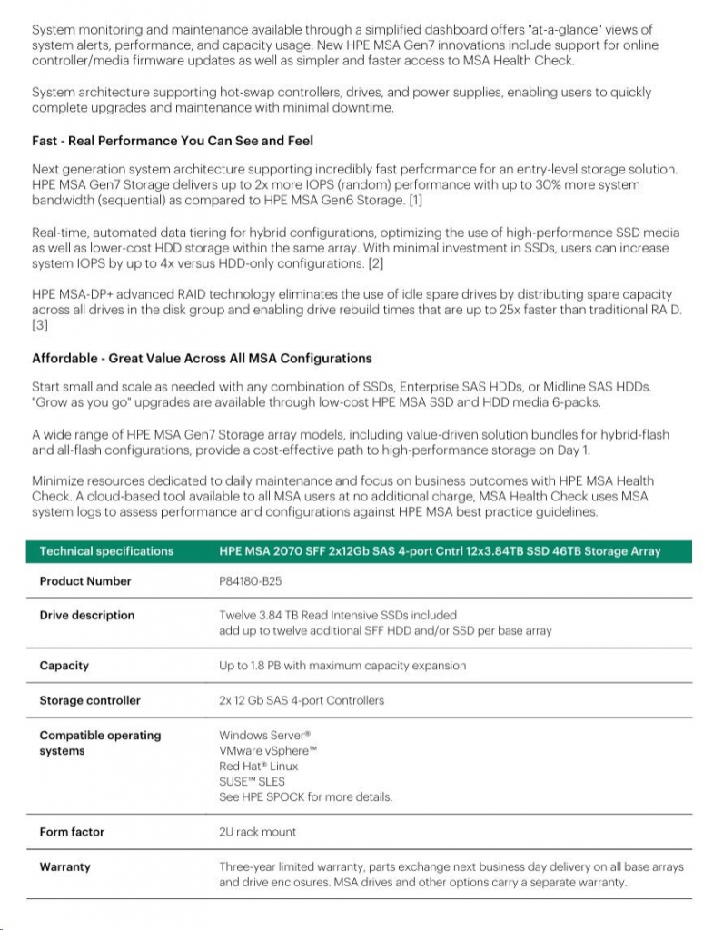 HPE MSA 2070 SFF 2x10/25GbE iSCSI 4-port Controller 12x3.84TB SSD 4x25Gb iSCSI XCVR 46TB Storage Array Smart Choice