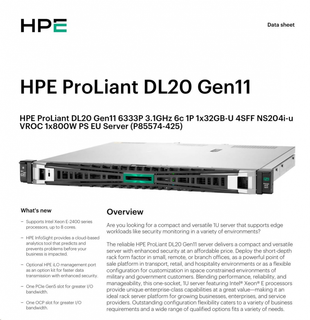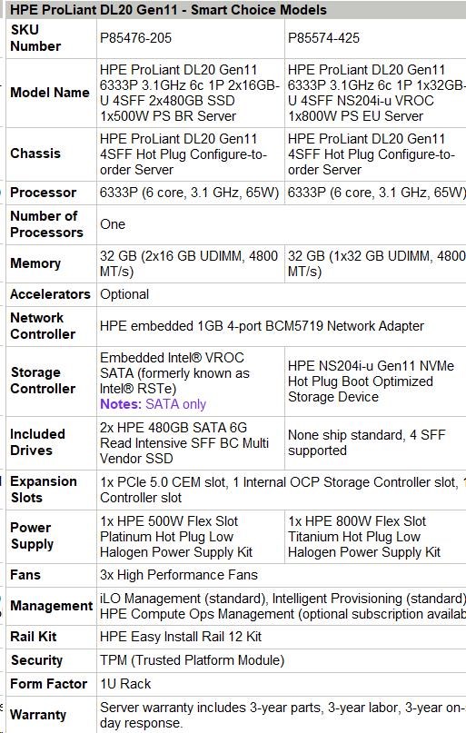 HPE PL DL20 gen11 6333P (3.1G/6C12T) 1x32G (P64339) 4SFF NS204i-u (2x480Gnvme) VROC 1x800W 4x1G NBD333 Smart Choice