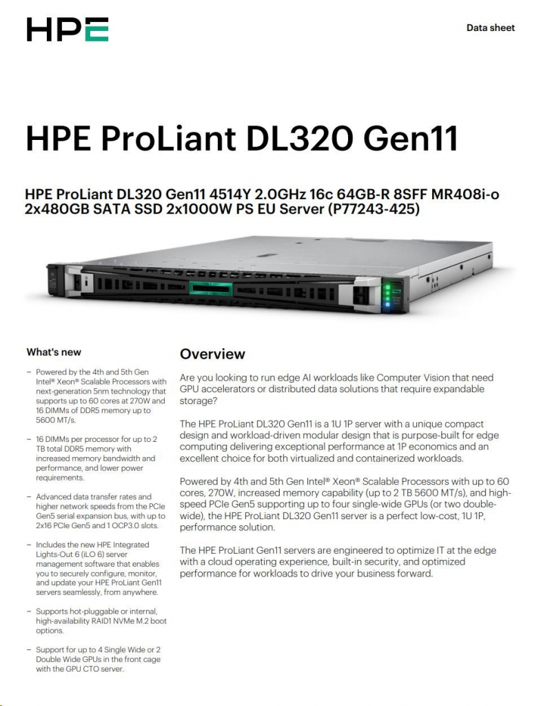 Model Name HPE PL DL320g11 4514Y (2.0/16C/4400) 2x32G 2x480G SATA SSD MR408i-o 8SFFBCU3 2x1000W 2x1Gb 1U EIR