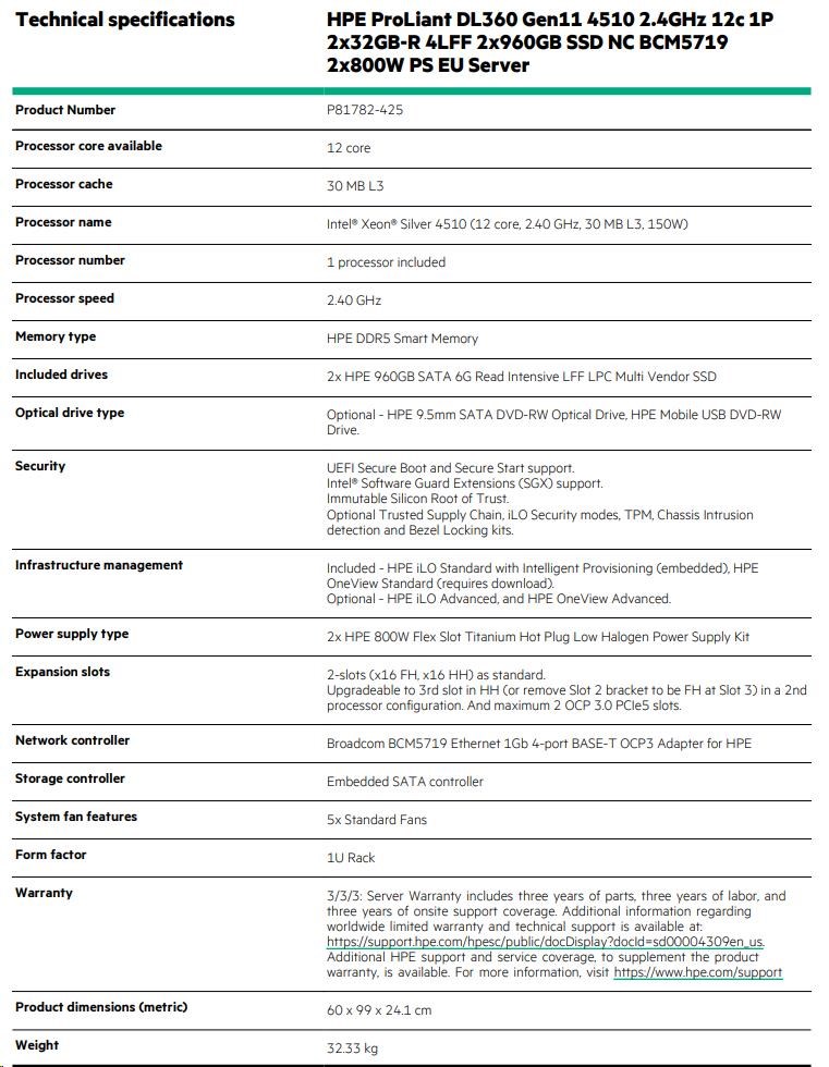 Provedení serveru:Rack, 1U Rack; Výrobce CPU:Intel; Maximální počet procesorů:2; Řada procesorů:Intel 12 Core Xeon; SSD Kapacita (GB):960; Model procesoru:Intel Xeon 4510; Velikost paměti RAM (GB):64; Maximální paměťová kapacita serveru (GB):3072; Maximální počet slotů PCIe:2; Maximální počet HDD v serveru:4; Hot-plug cage pro HDD:3.5" LFF; RAID:1, 10