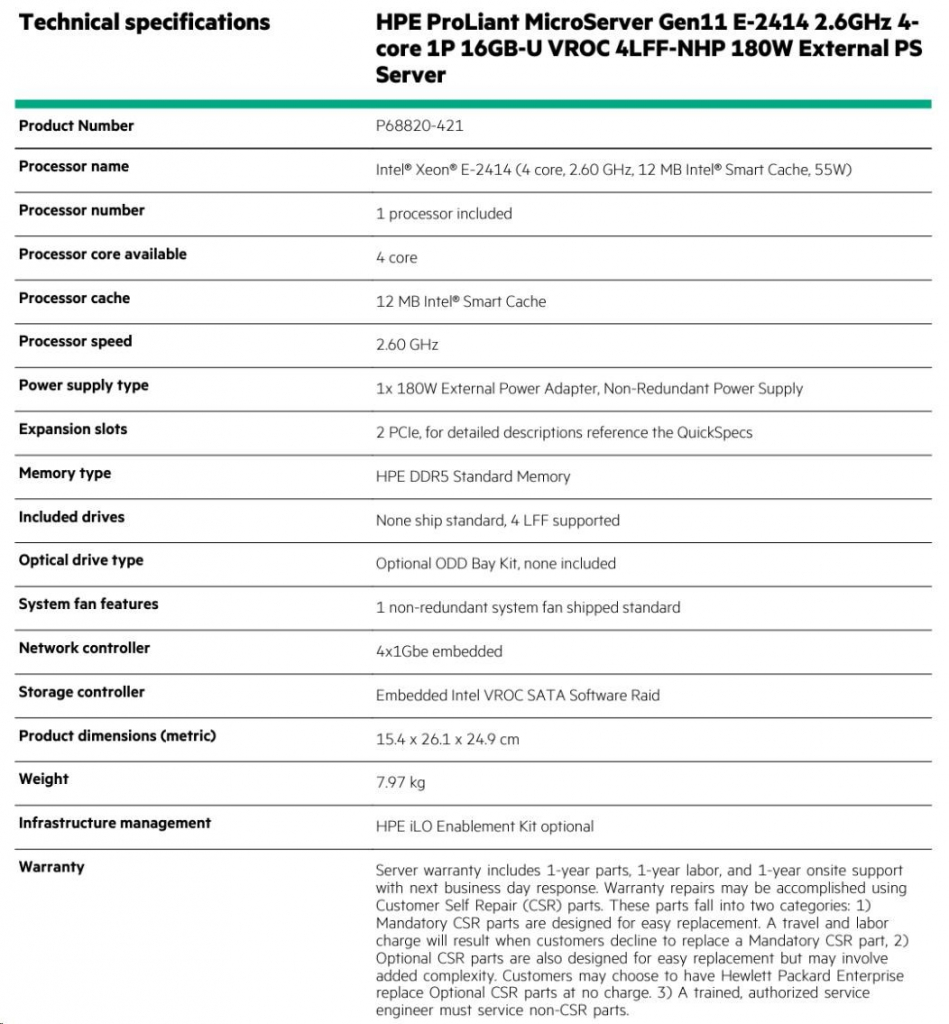 Technical specifications HPE ProLiant MicroServer Gen11 E-2414 2.6GHz 4core 1P 16GB-U VROC 4LFF-NHP 180W External PS Server P68820-421