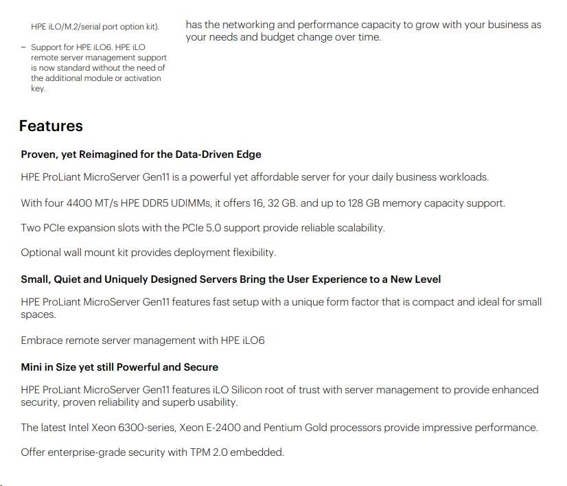 HPE ProLiant MicroServer Gen11 poskytuje cenově dostupný kompaktní, ale výkonný server základní úrovně, který si můžete přizpůsobit pro místní, okrajové, hybridní cloudy nebo dokonce pracovní zátěže náročné na výkon datového centra. Má ultra mini věžový tvarový faktor a lze jej umístit naplocho nebo svisle nebo namontovat na stěnu v závislosti na prostředí zákazníka. Nejnovější podporované procesory Intel Xeon E a Pentium dodávají serveru výpočetní výkon, zabezpečení a vzdálenou správu s křemíkovým kořenem důvěry HPE iLO. Spolu s dalšími vylepšeními, jako jsou 4 sloty DIMM pro paměti DDR5 a 2 sloty PCIe, ať už chcete server pro všeobecné použití, NAS nebo dokonce virtualizační server, budete překvapeni, kolik toho můžete z tohoto malého a cenově dostupného serveru vytěžit.