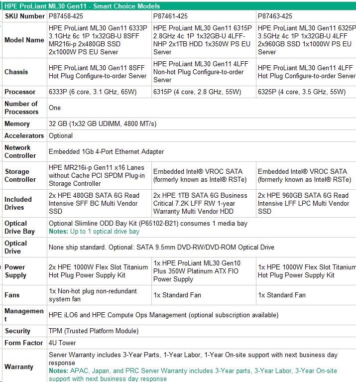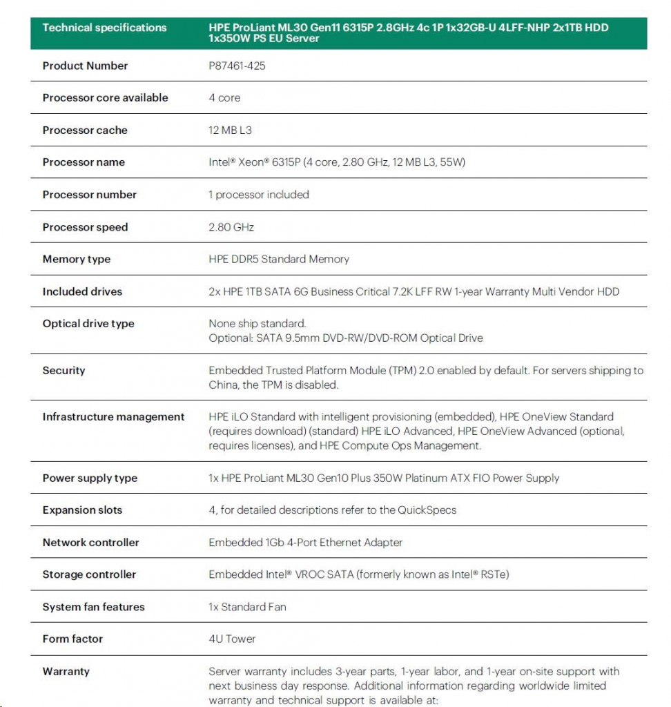 HPE PL ML30g11 6315P (2.8-5.2G/4C4T) 1x32G 2x1TB SATA 4LFF-NHP 1x350 VROC 4p1G NBD311 Smart Choice