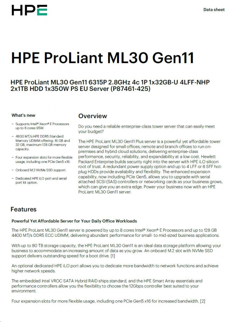 HPE PL ML30g11 6325P (3.5G/4C8T) 1x32G 2x960G SSD SATA 4LFF-HP VROC 1x1000W 4p1G NBD311 Smart Choice