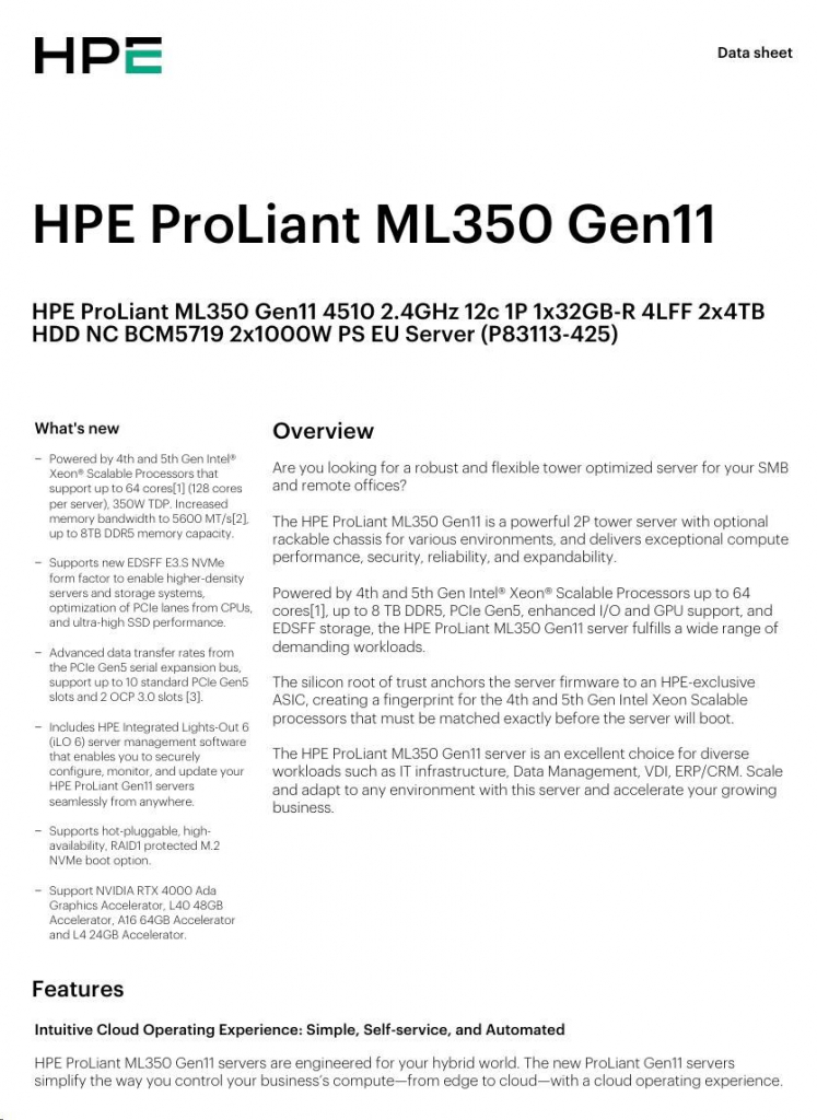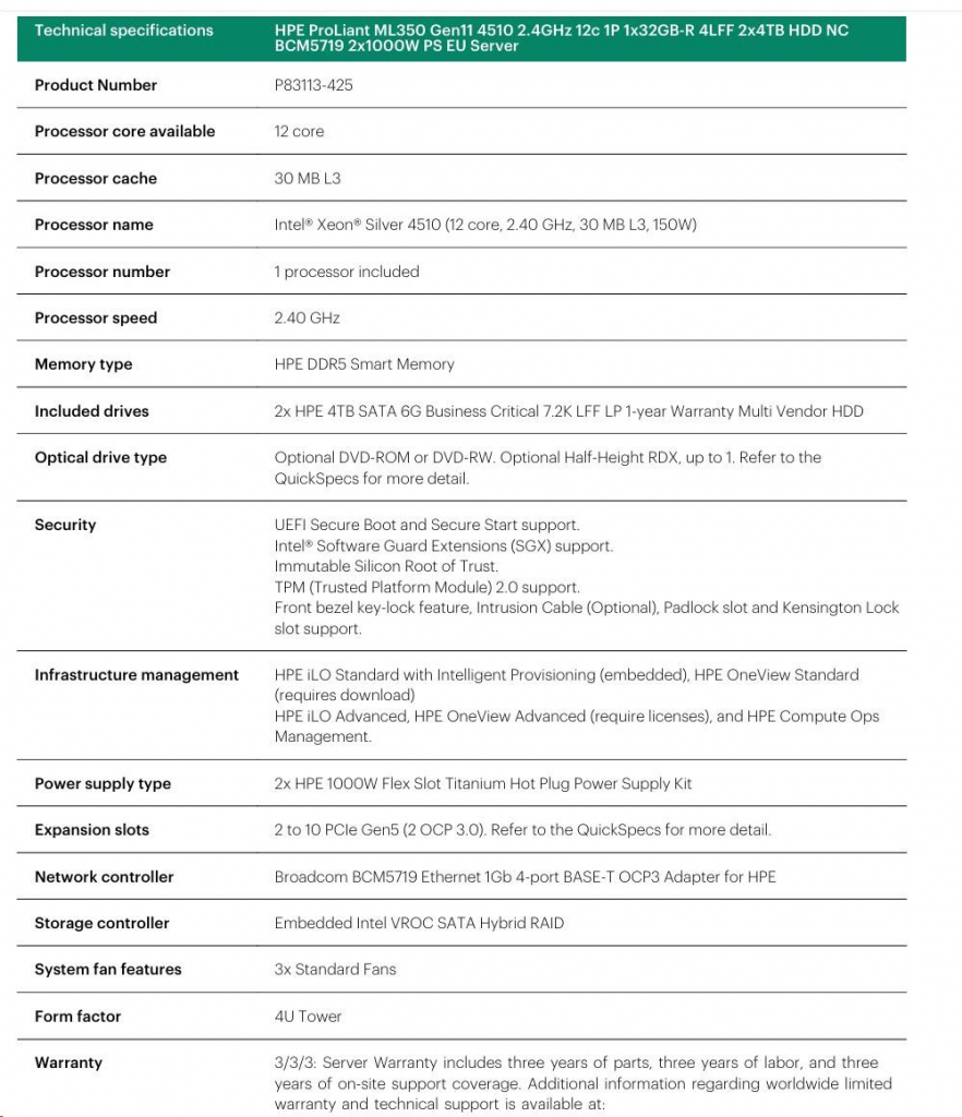 Provedení serveru:Tower; Výrobce CPU:Intel; Maximální počet procesorů:2; Řada procesorů:Intel 12 Core Xeon; SSD Kapacita (GB):480; Model procesoru:Intel Xeon 4510; Velikost paměti RAM (GB):32; Maximální paměťová kapacita serveru (GB):3072; Maximální počet slotů PCIe:6 a více; HDD Kapacita (GB):4000; Maximální počet HDD v serveru:12