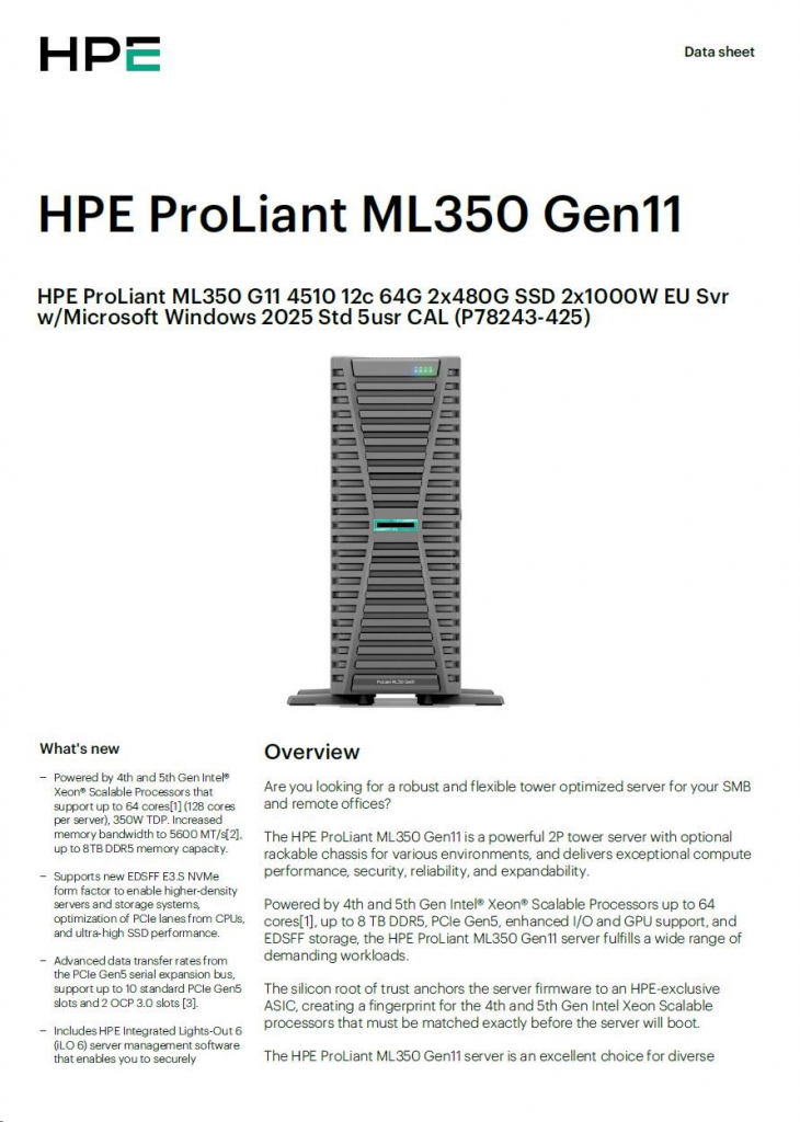 Model Name HPE PL ML350g11 4510 (2.4G/12C) 2x32G 2x960G 2x1000W MR408i-o 8-24SFFU3
