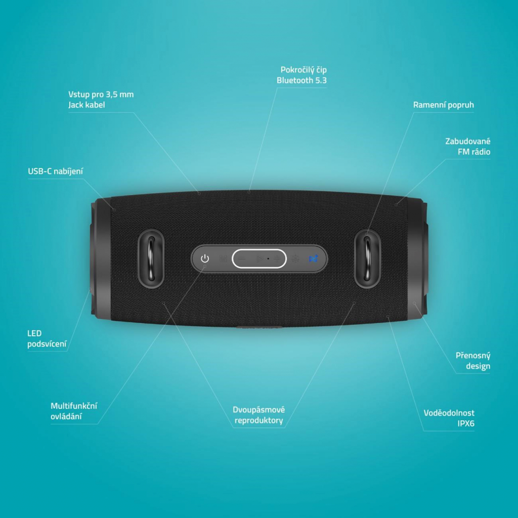 Způsob použití:K mobilu / PC; Outdoor použití; Stupeň krytí IP:IPX6; Výkon reproduktoru (W):60; Barva reproduktoru:Černá; LED světla; Funkce reproduktoru:FM rádio; Typ připojení:Bluetooth, Jack 3,5 mm; Bluetooth verze:5.3; Slot MicroSD; Typ baterie:Li-Ion; Kapacita baterie (mAh):4500; Výdrž baterie (h):9; Hmotnost (g):2100; Způsob nabíjení:USB-C