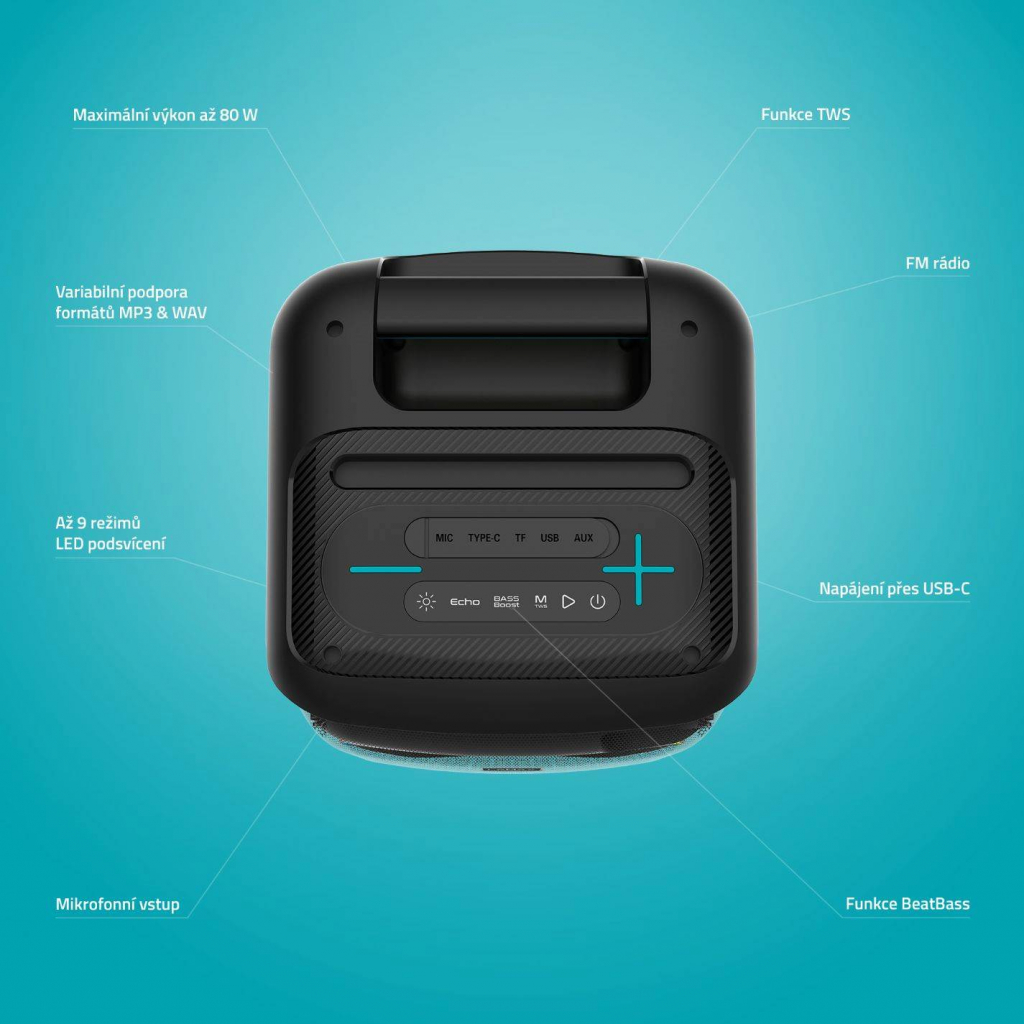 Způsob použití:Na párty; Outdoor použití; Výkon reproduktoru (W):80; Barva reproduktoru:Černá; LED světla; Typ připojení:Bluetooth, Jack 3,5 mm; Bluetooth verze:5.3; Slot MicroSD; Typ baterie:Li-Ion; Kapacita baterie (mAh):6000; Výdrž baterie (h):13; Hmotnost (g):4500; Způsob nabíjení:USB-C