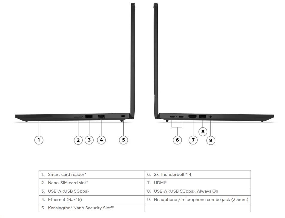Standartné porty | 1x USB-A (USB 5Gbps / USB 3.2 Gen 1) 1x USB-A (USB 5Gbps / USB 3.2 Gen 1), Always On 2x USB-C (Thunderbolt™ 4 / USB4 40Gbps), with USB PD 3.0 and DisplayPort™ 2.1 1x HDMI 2.1, up to 4K/60Hz 1x Headphone / microphone combo jack (3.5mm) 1x Ethernet (RJ-45) |