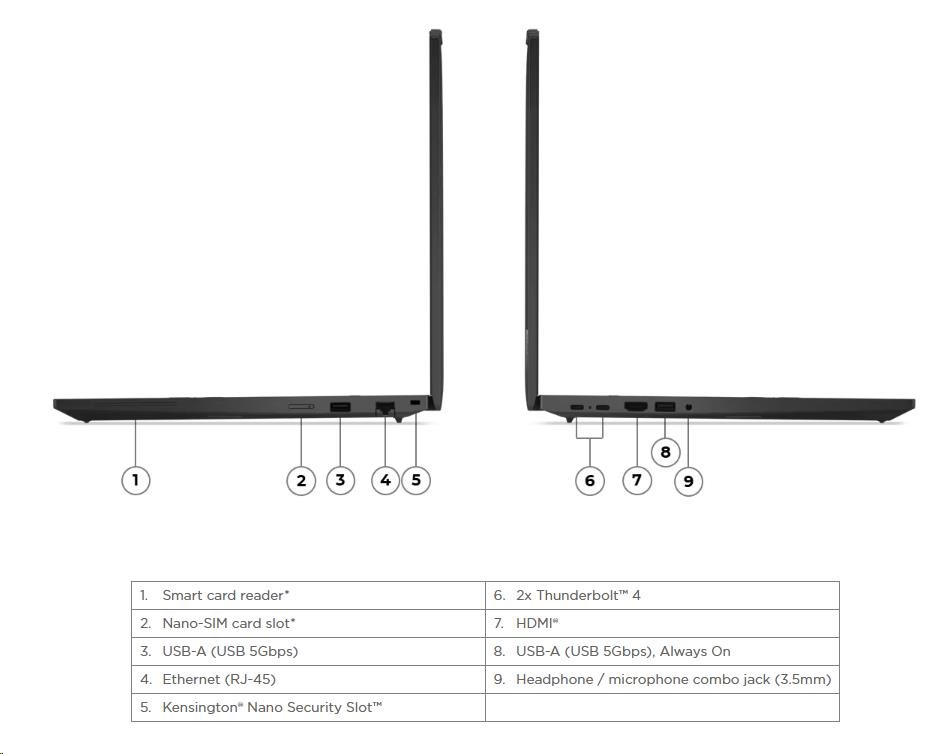 Standartné porty | 1x USB-A (USB 5Gbps / USB 3.2 Gen 1) 1x USB-A (USB 5Gbps / USB 3.2 Gen 1), Always On 2x USB-C (Thunderbolt™ 4 / USB4 40Gbps), with USB PD 3.0 and DisplayPort™ 2.1 1x HDMI 2.1, up to 4K/60Hz 1x Headphone / microphone combo jack (3.5mm) 1x Ethernet (RJ-45) |
