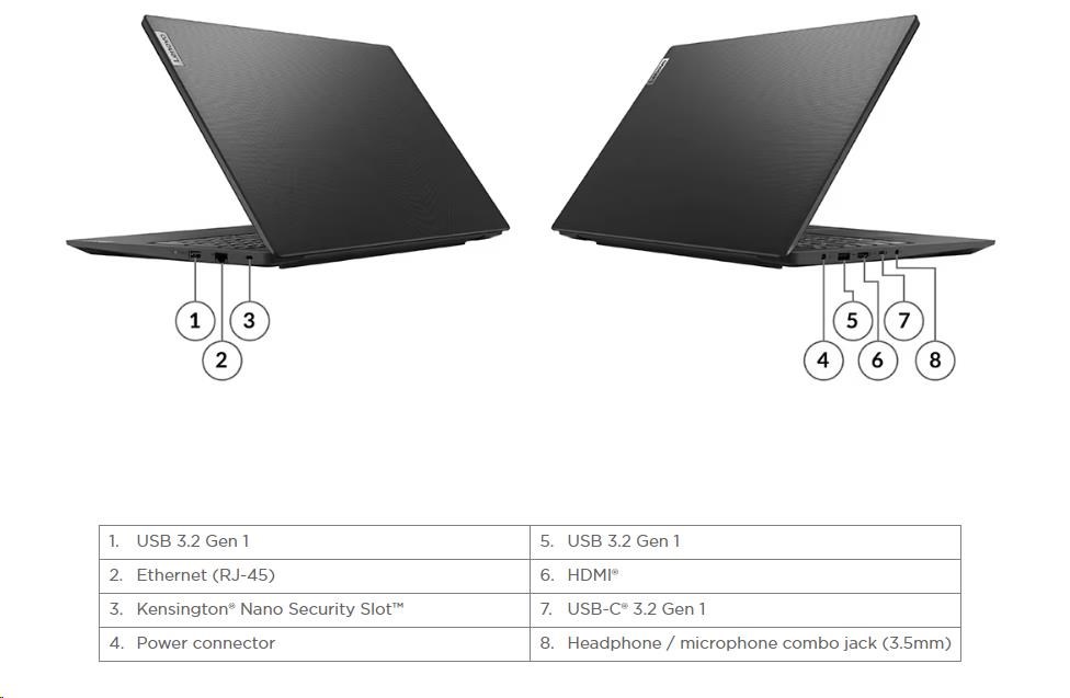 Standartné porty | 2x USB 3.2 Gen 1 1x USB-C 3.2 Gen 1 (support data transfer, Power Delivery (20V only) and DisplayPort™ 1.2) 1x HDMI 1.4b 1x Headphone / microphone combo jack (3.5mm) 1x Ethernet (RJ-45) 1x Power connector |